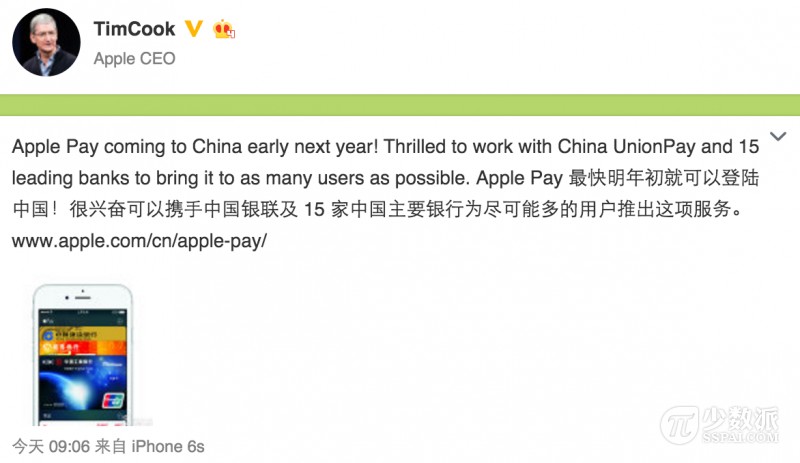今天早上,苹果 CEO Tim Cook 发布了一条微博,宣布 Apple Pay 将于 2016 年初正式登陆中国,苹果官网也同时上线了宣传页面。