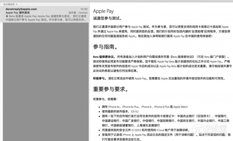 另外据一些读者反应,苹果目前在陆续发放一些内部测试,参与者可提前体验 Apple Pay。据说 iPhone 6s 的用户有更大几率收到哦。